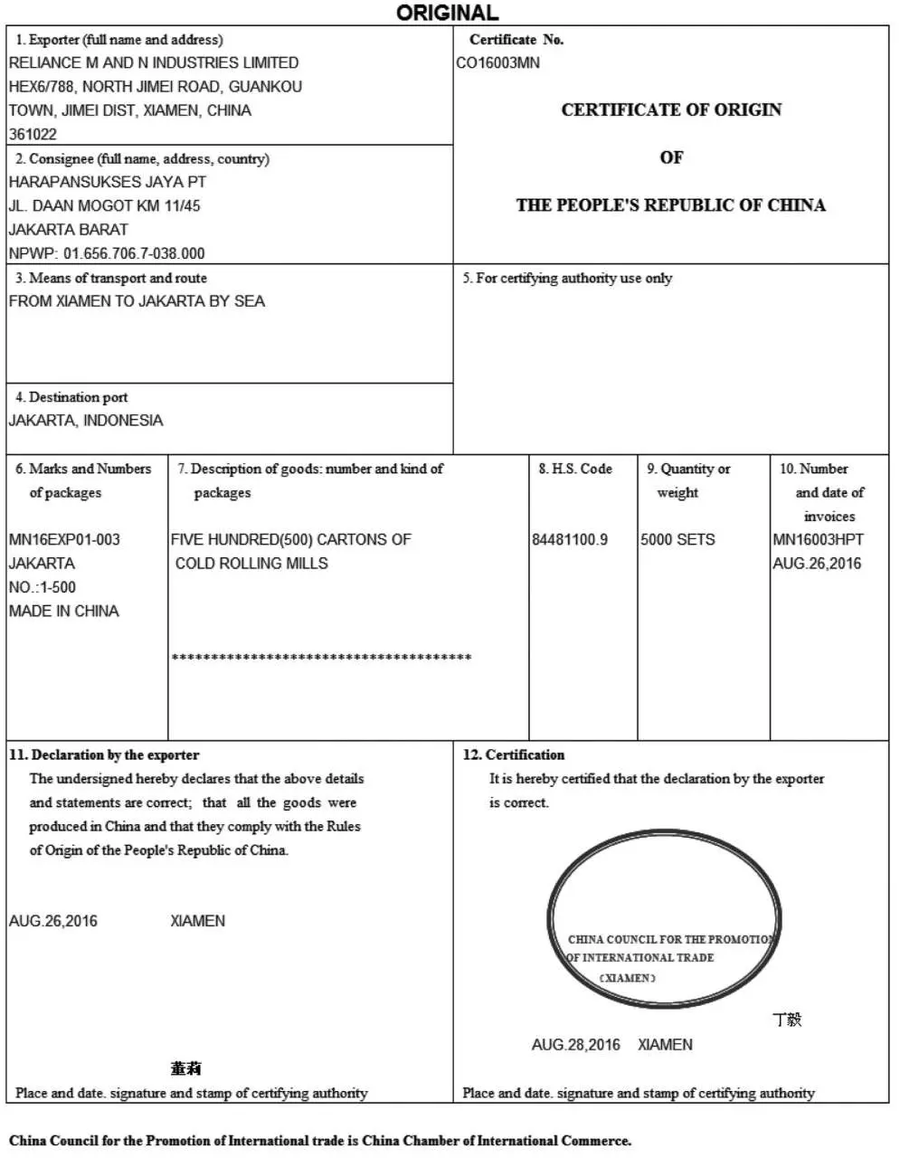 二、一般原产地证书(CERTIFICATE OF ORIGIN, C/O)
