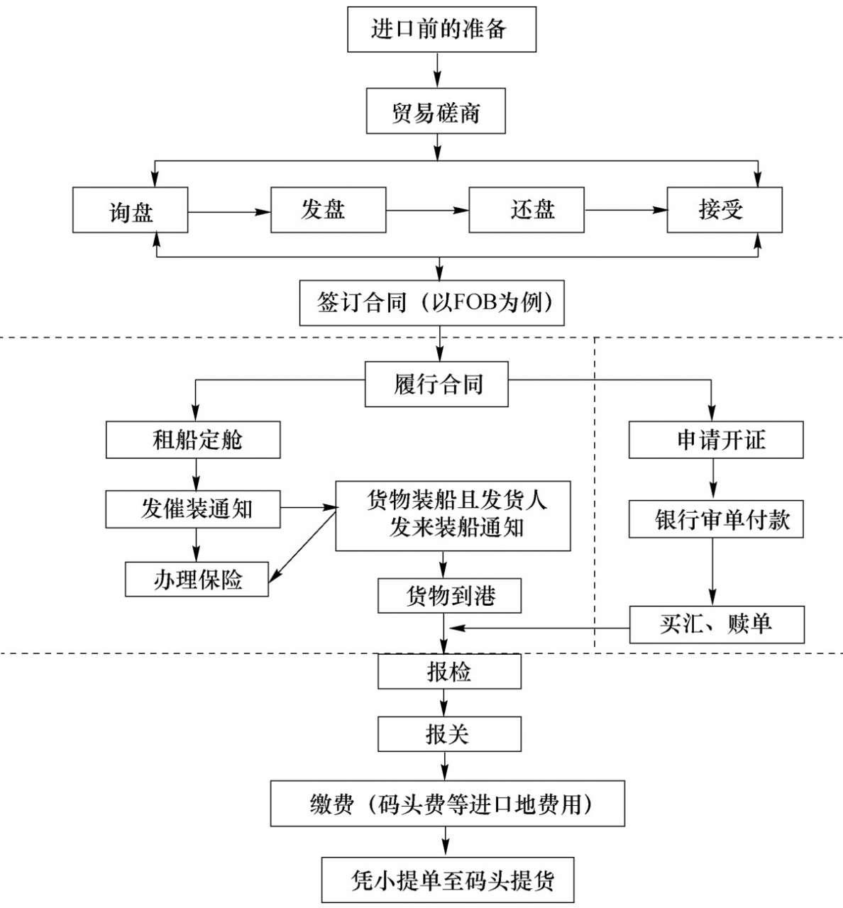 在国际货物买卖合同中,买卖双方就共同的标的进行谈判,他们在权利、义务和运作程序上正好相反。卖方的权利便是买方的义务,卖方的义务便是买方的权利;卖方履行合同是从备货到收款,买方履行合同则是从付款到接货。以 FOB 价格条件成交,以信用证方式结算货款的合同为例,买方履行进口合同的程序可以概括为证(申请、开立信用证)、船(租船订舱、保险)、款(审单付汇)、货(报关、接货、检验)。