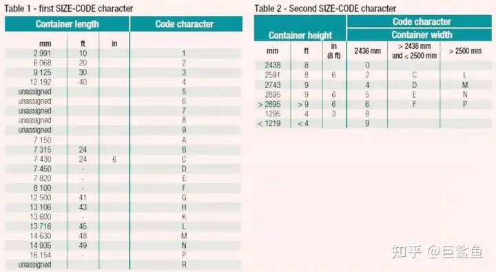 共4位,第一位表示箱长,第二位表示箱高,最后两位表示箱型。根据ISO 6346:1995定义如下: